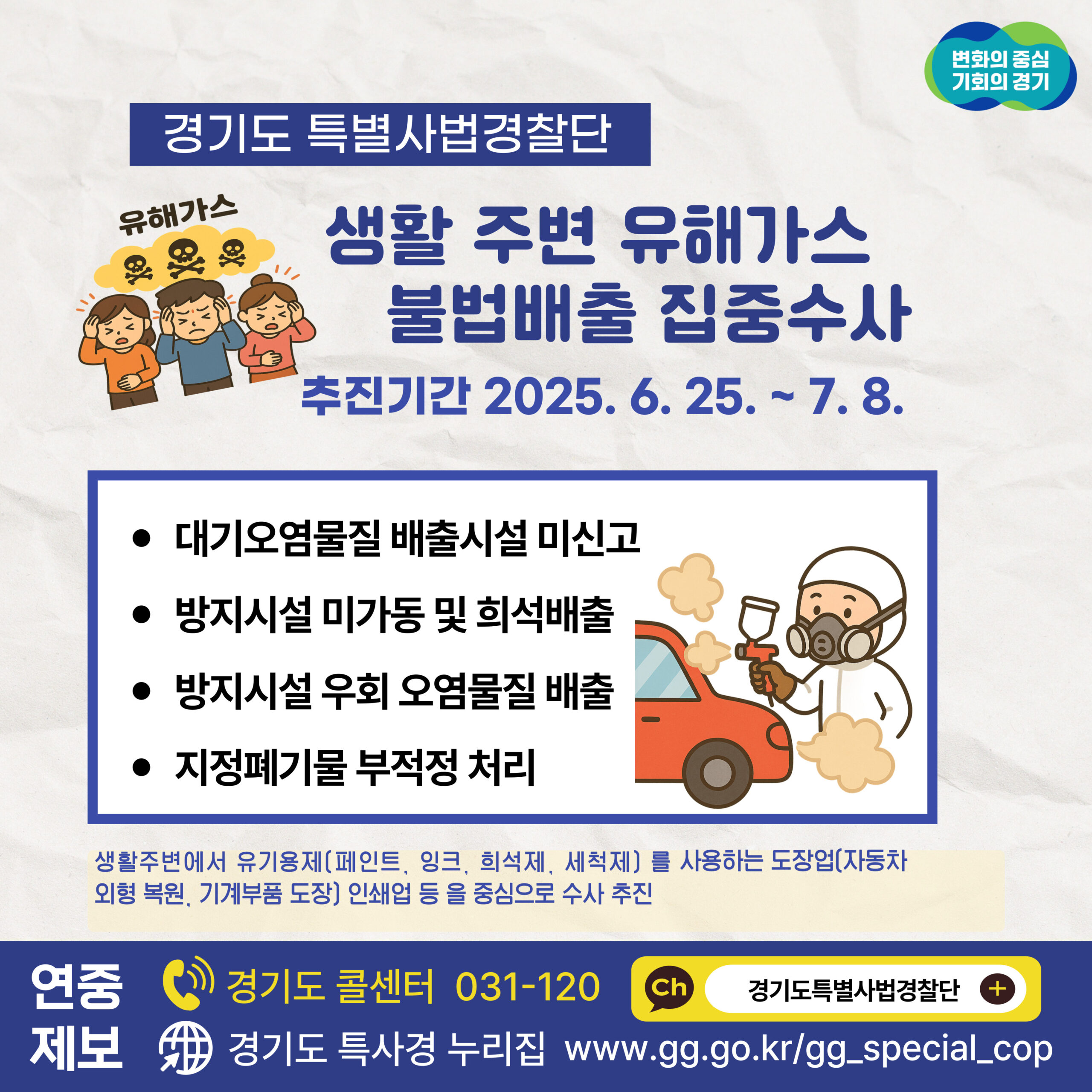 경기도는 6월 25일부터 7월 8일까지 생활주변(주거지역, 상업지역, 계획관리지역)에서 유기용제(페인트, 잉크, 희석제, 세척제 등)를 사용하는 도장업 및 인쇄업을 중심으로 ‘유해가스 불법배출 집중수사’를 실시한다.