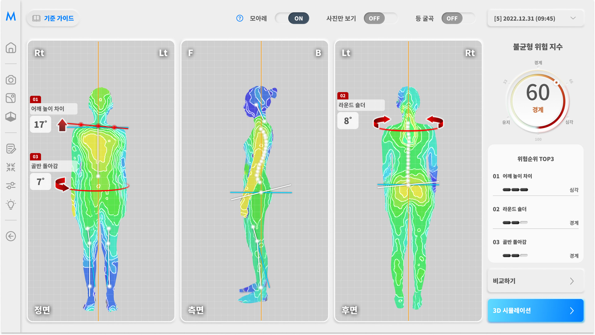 분석 항목에는 ▲좌우 신체 불균형 ▲척추 정렬 ▲골반 기울기 ▲체중 분포 및 무게 중심 등이 포함되며,